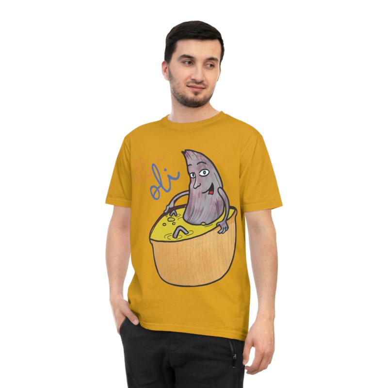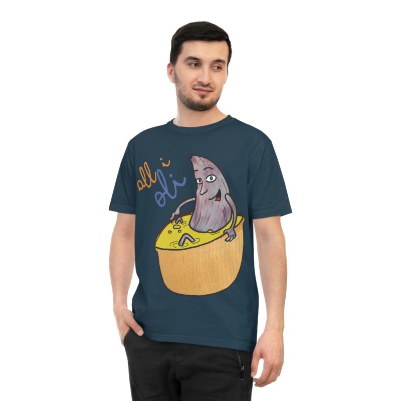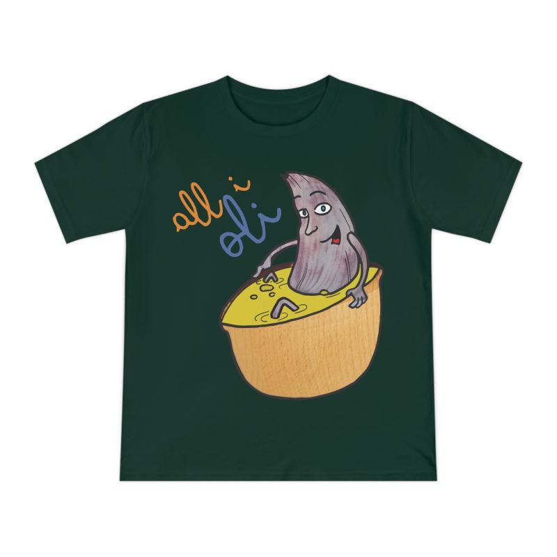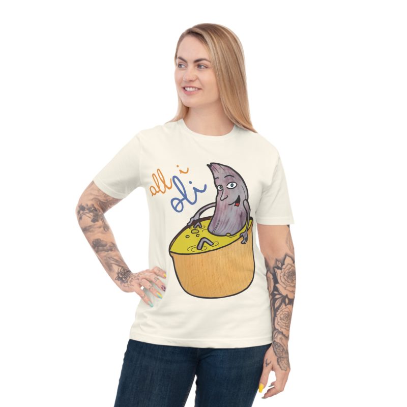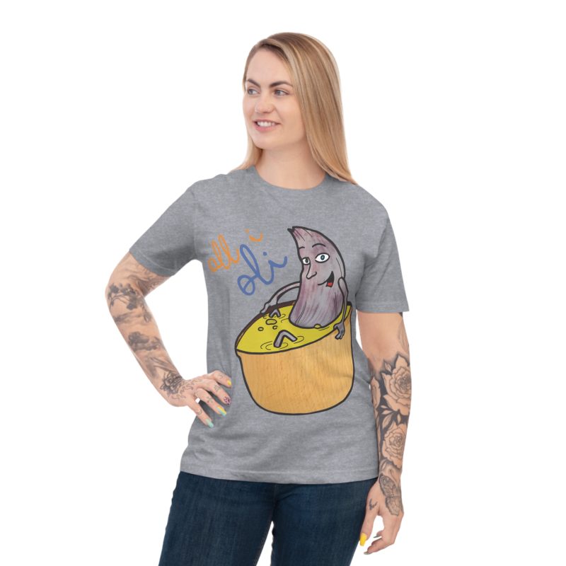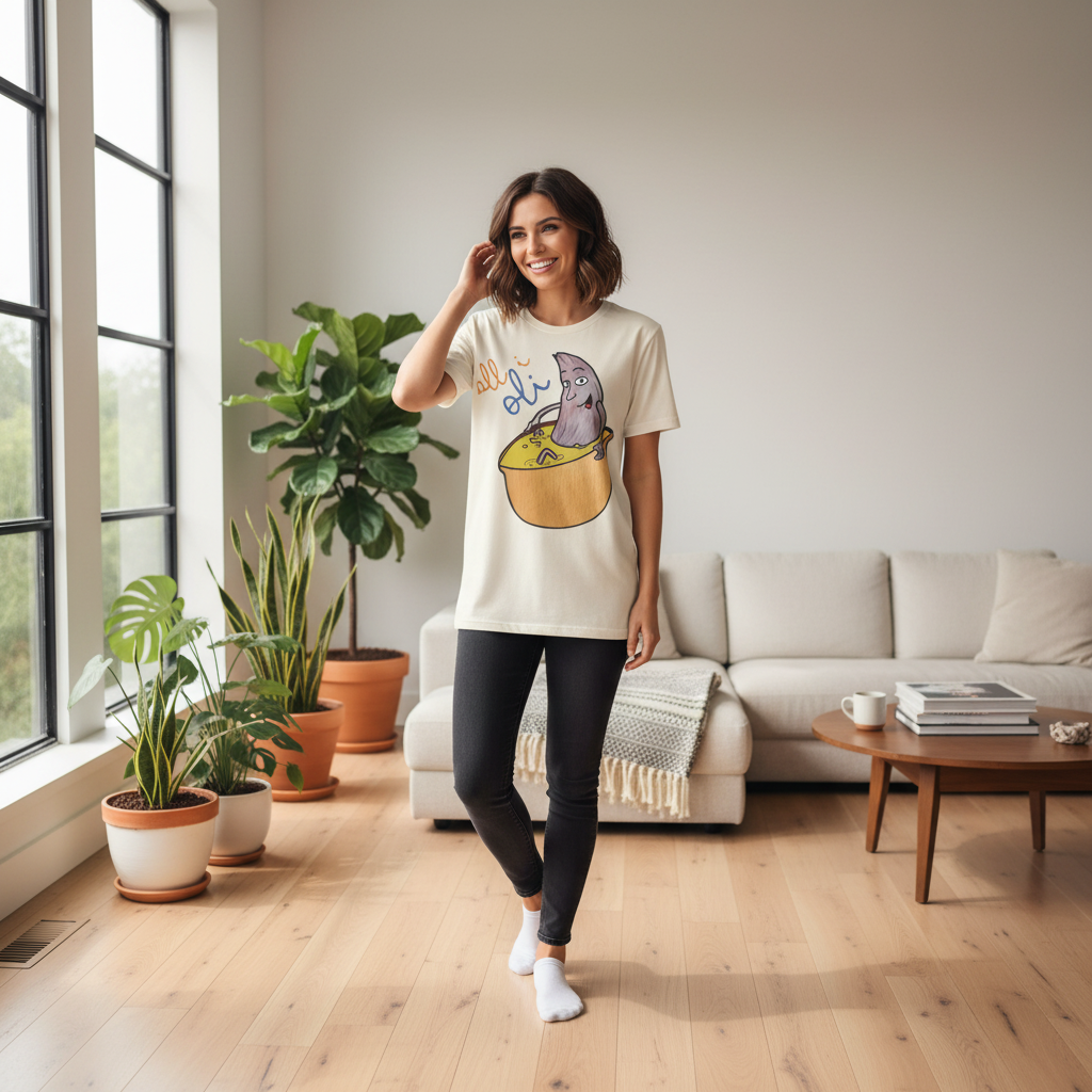¡Esta no es una camiseta cualquiera, es una dosis de alegría mediterránea! Nuestro personaje All i Oli, dibujado a mano, se relaja plácidamente en un bol de aceite de oliva, transmitiendo esa felicidad simple de la buena comida. Hecha de algodón orgánico peinado 100%, es increíblemente suave y transpirable. Perfecta para sentirte cómodo y con estilo en tu día a día, ya sea yendo al mercado, en un brunch con amigos o simplemente descansando en casa.