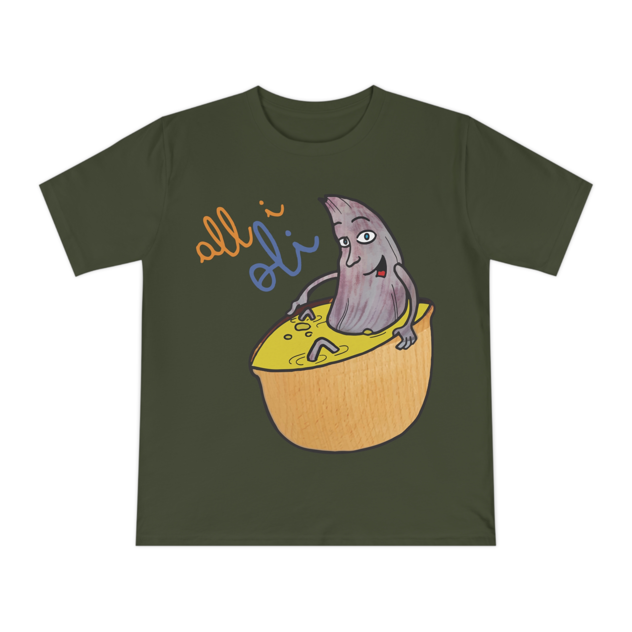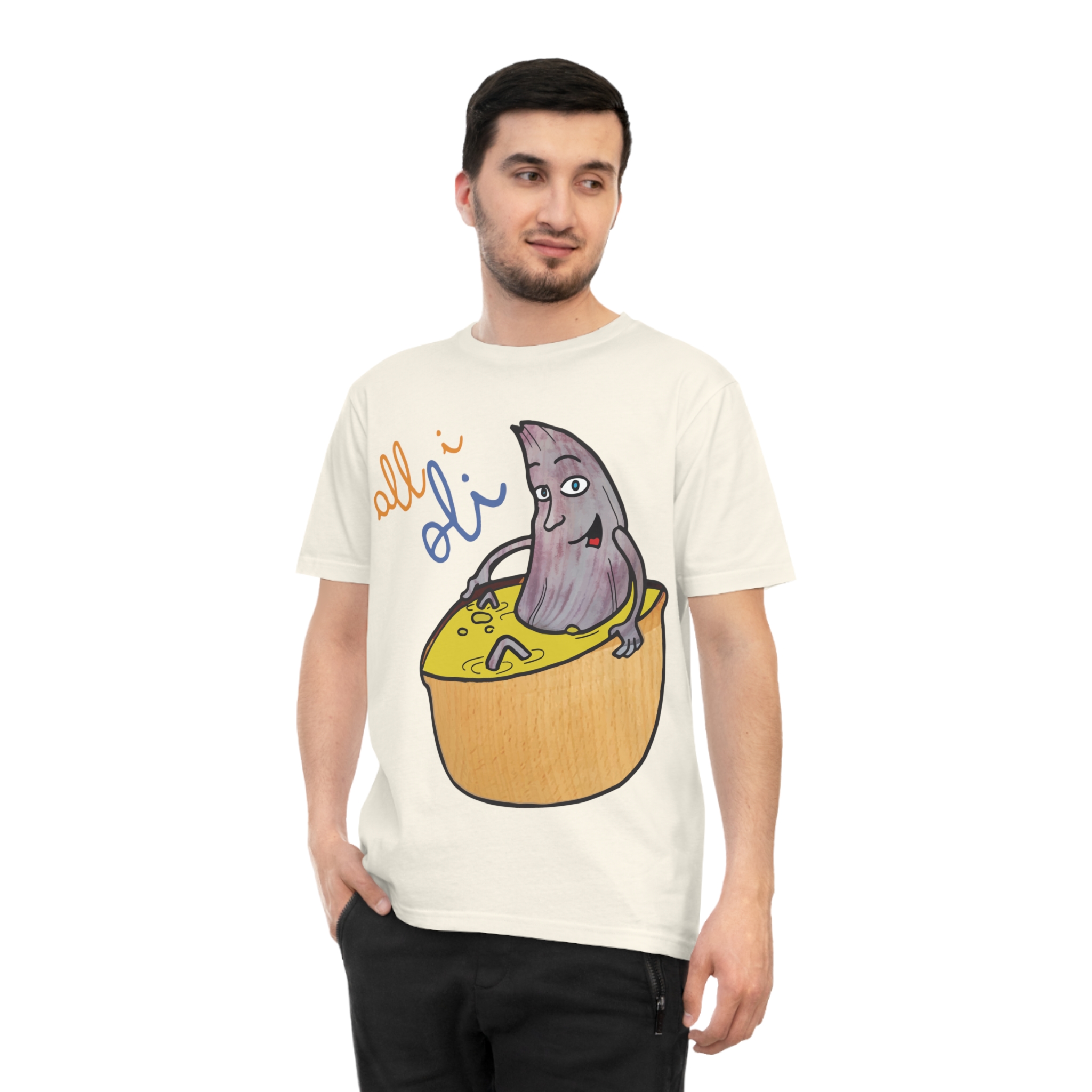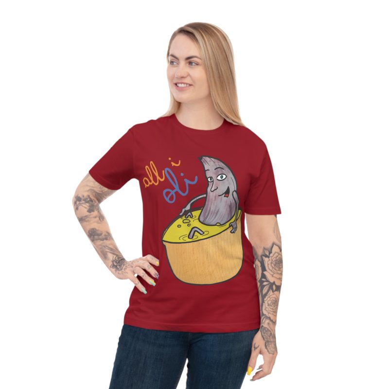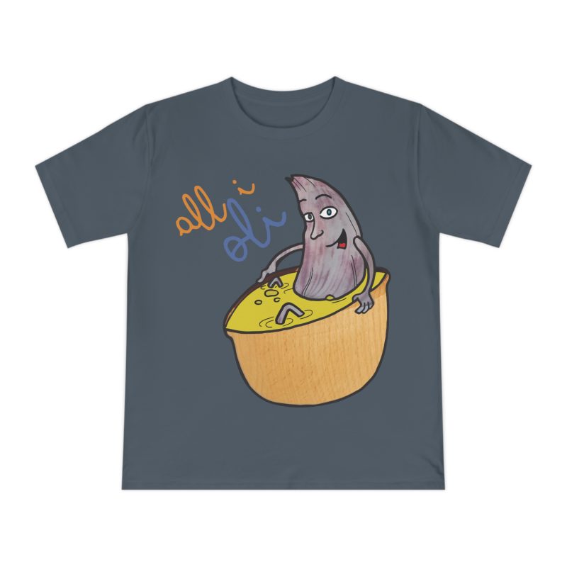 ¡Esta no es una camiseta cualquiera, es una dosis de alegría mediterránea! Nuestro personaje All i Oli, dibujado a mano, se relaja plácidamente en un bol de aceite de oliva, transmitiendo esa felicidad simple de la buena comida. Hecha de algodón orgánico peinado 100%, es increíblemente suave y transpirable. Perfecta para sentirte cómodo y con estilo en tu día a día, ya sea yendo al mercado, en un brunch con amigos o simplemente descansando en casa.