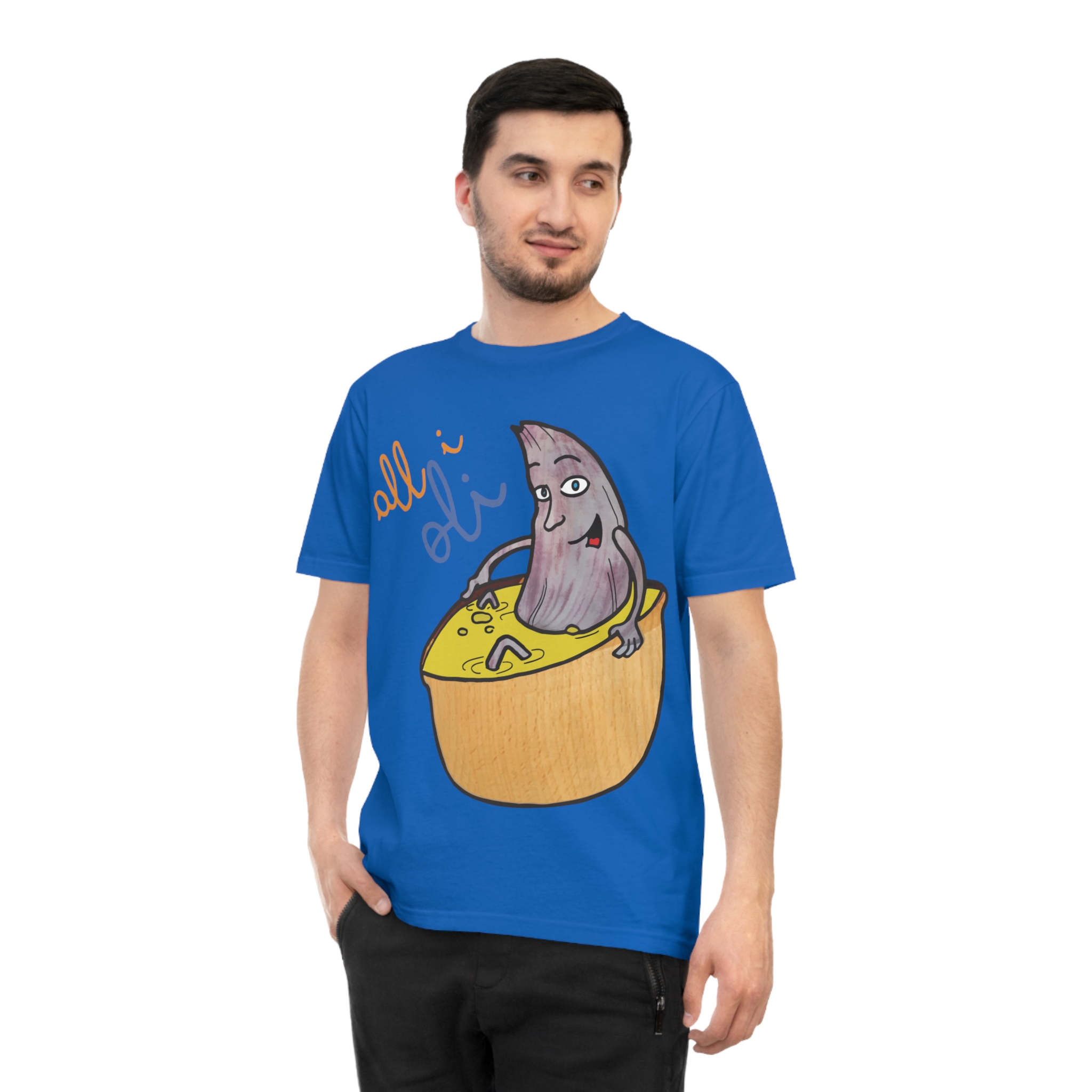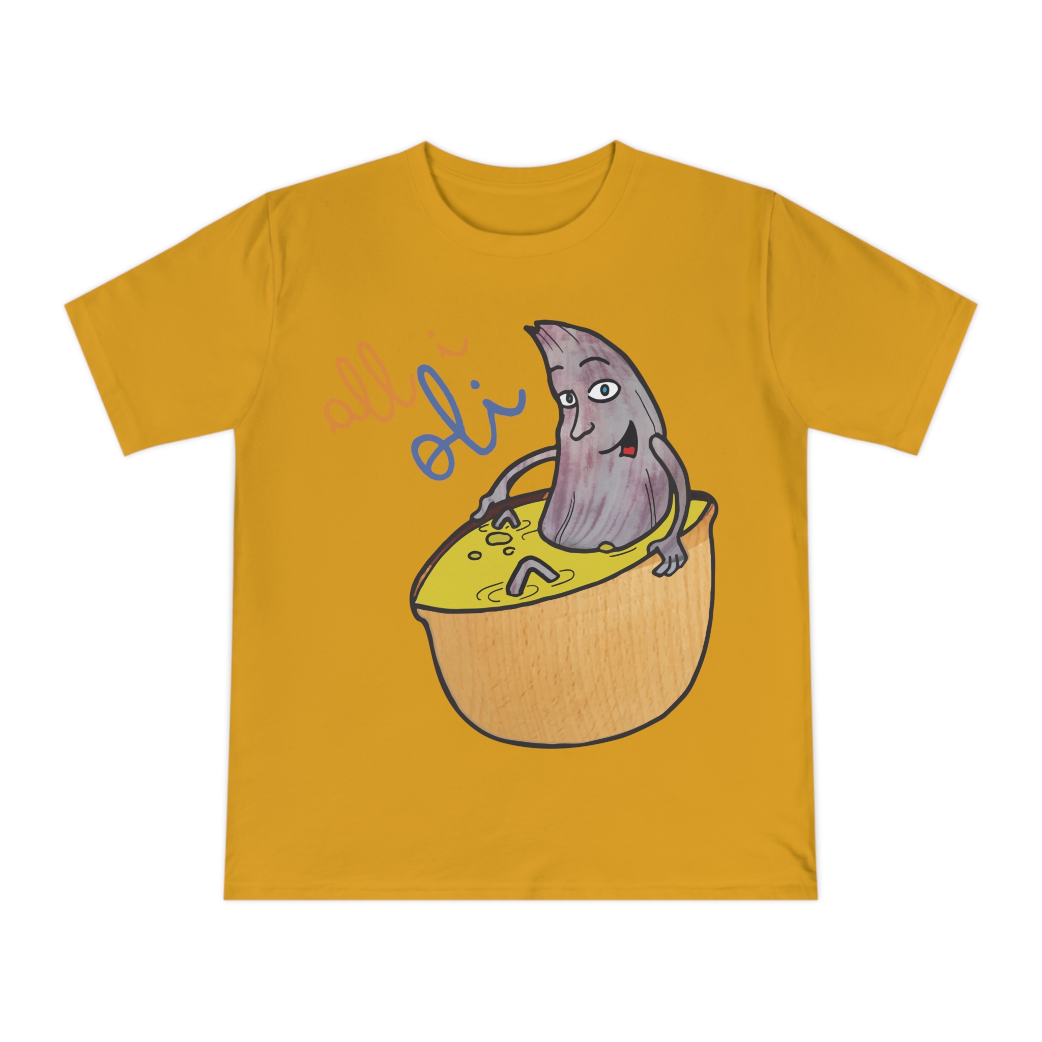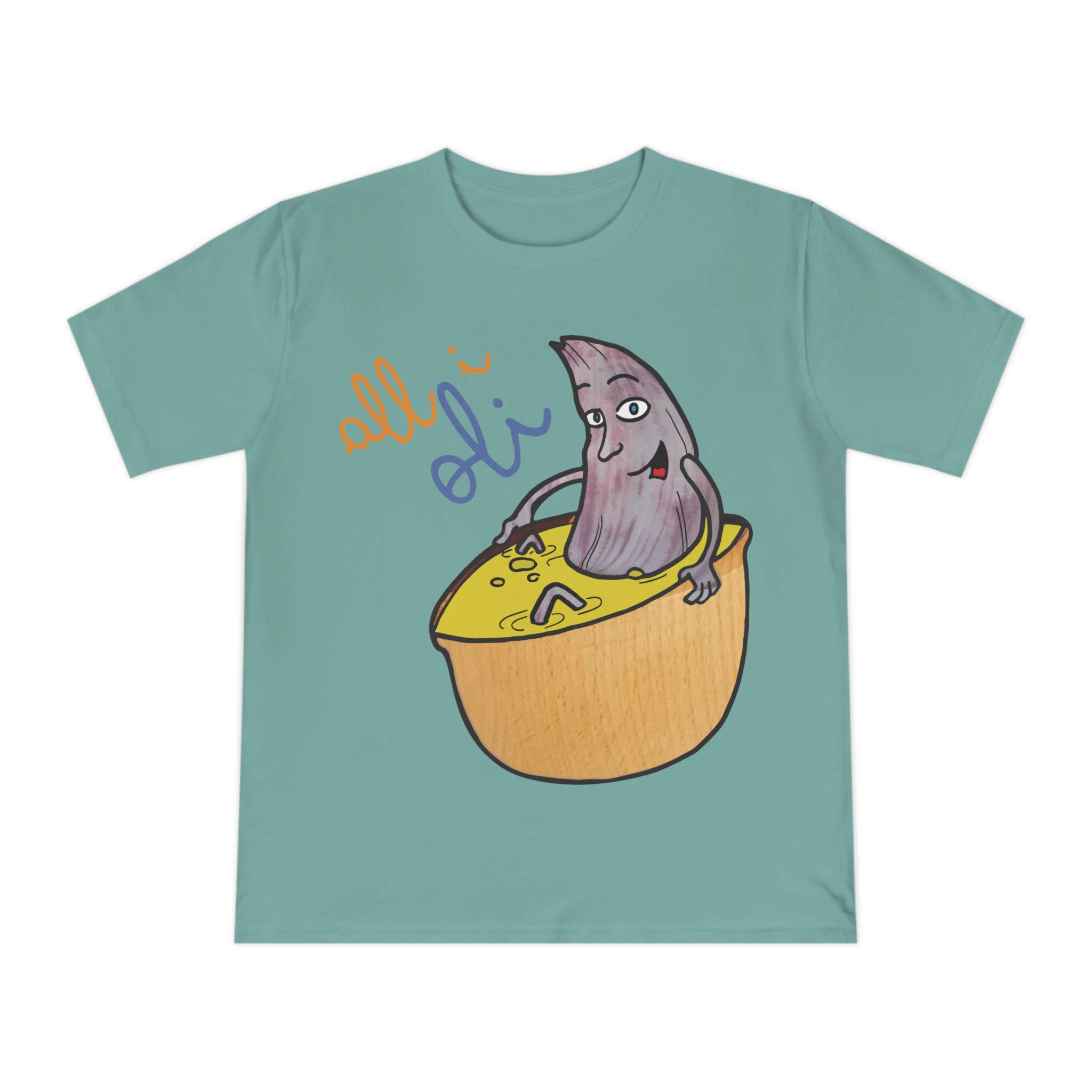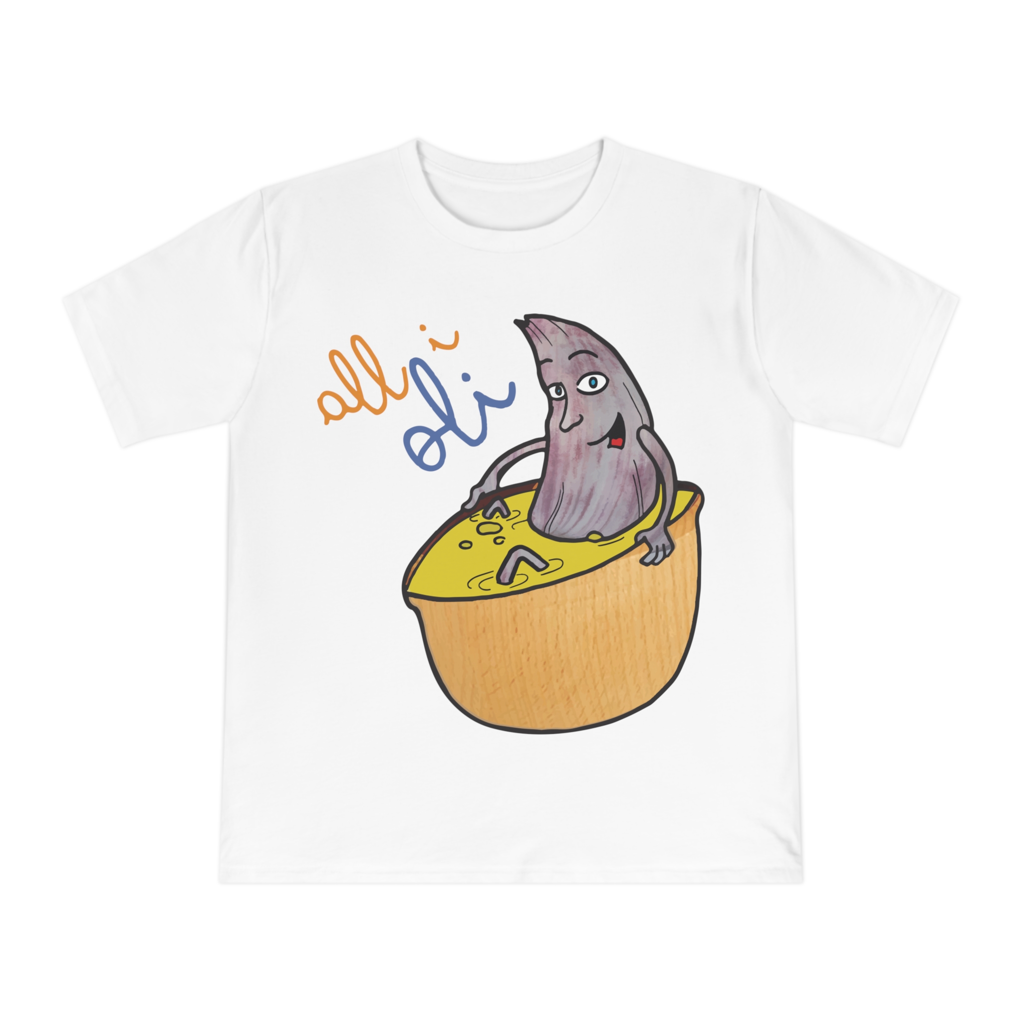 ¡Esta no es una camiseta cualquiera, es una dosis de alegría mediterránea! Nuestro personaje All i Oli, dibujado a mano, se relaja plácidamente en un bol de aceite de oliva, transmitiendo esa felicidad simple de la buena comida. Hecha de algodón orgánico peinado 100%, es increíblemente suave y transpirable. Perfecta para sentirte cómodo y con estilo en tu día a día, ya sea yendo al mercado, en un brunch con amigos o simplemente descansando en casa.