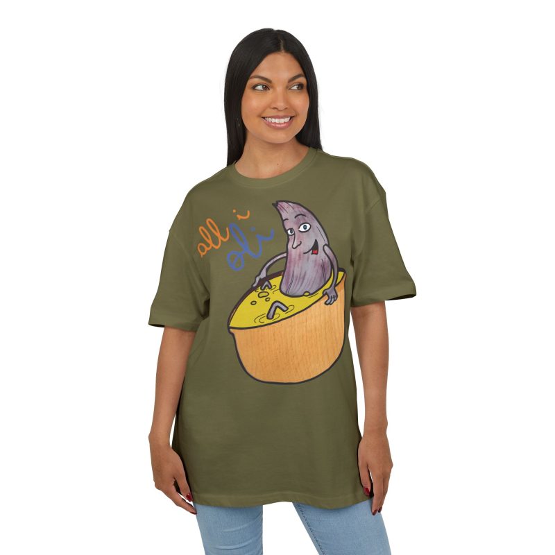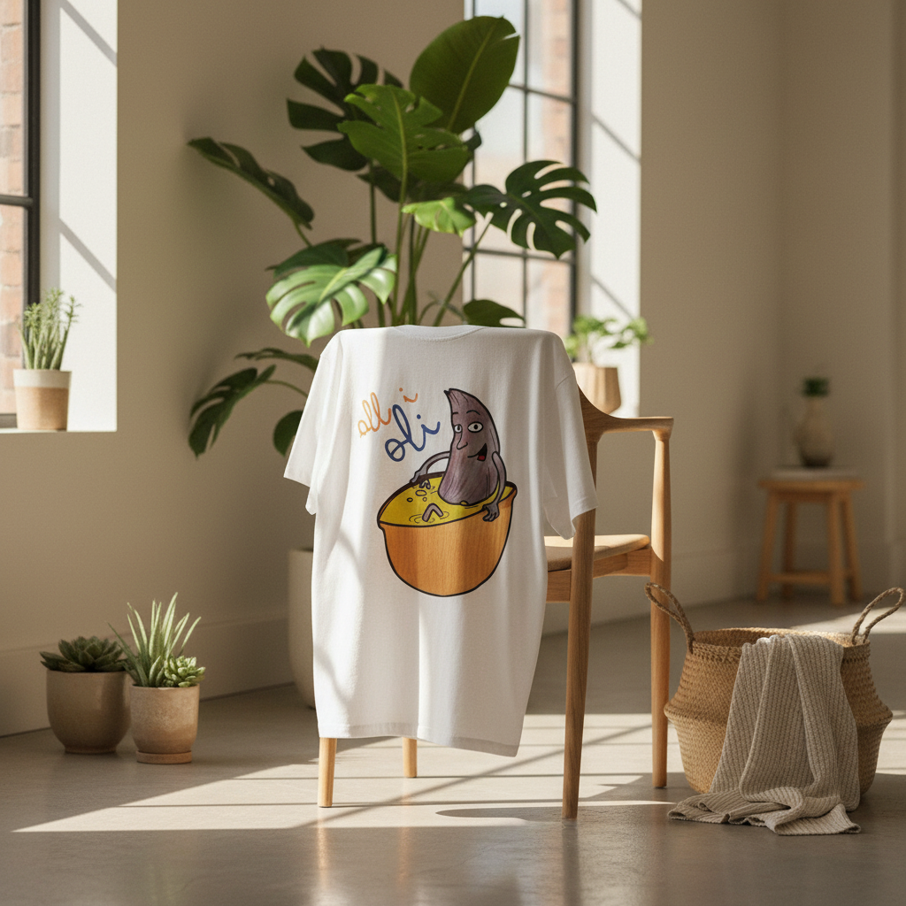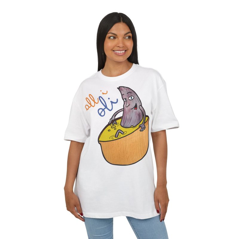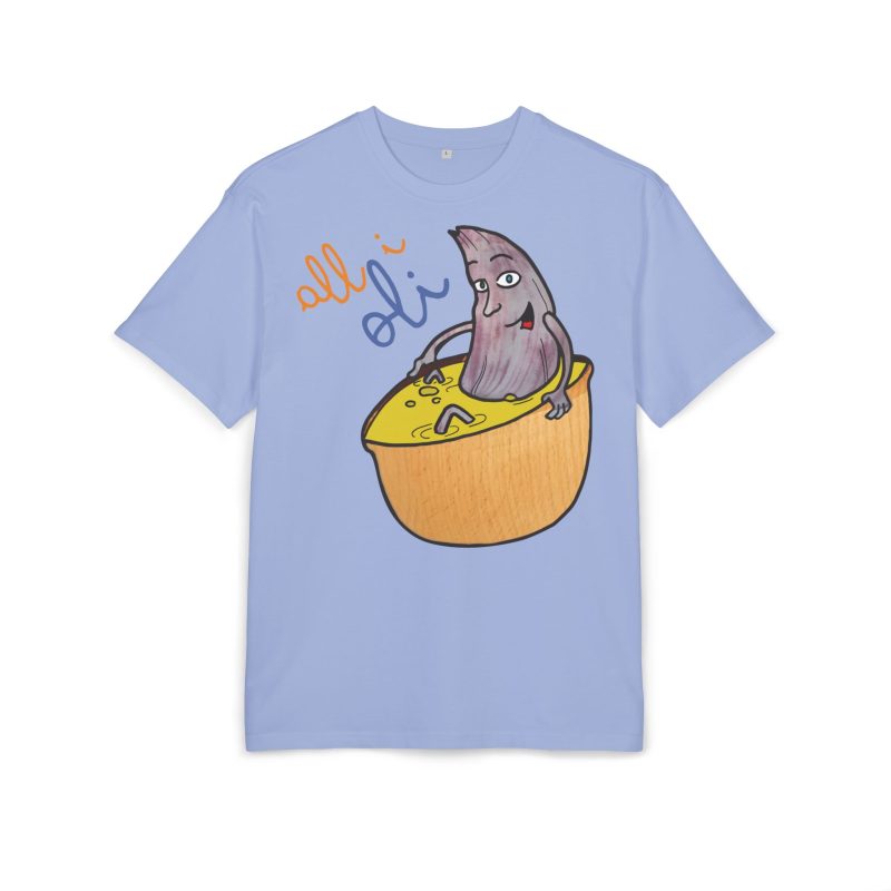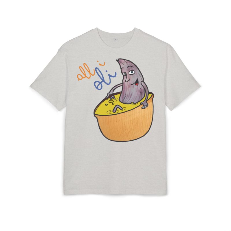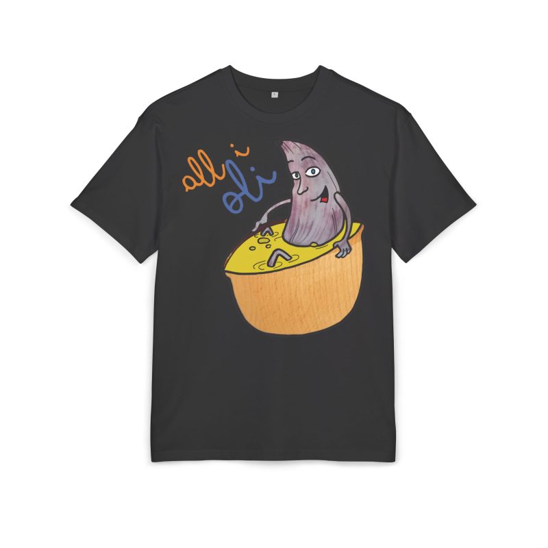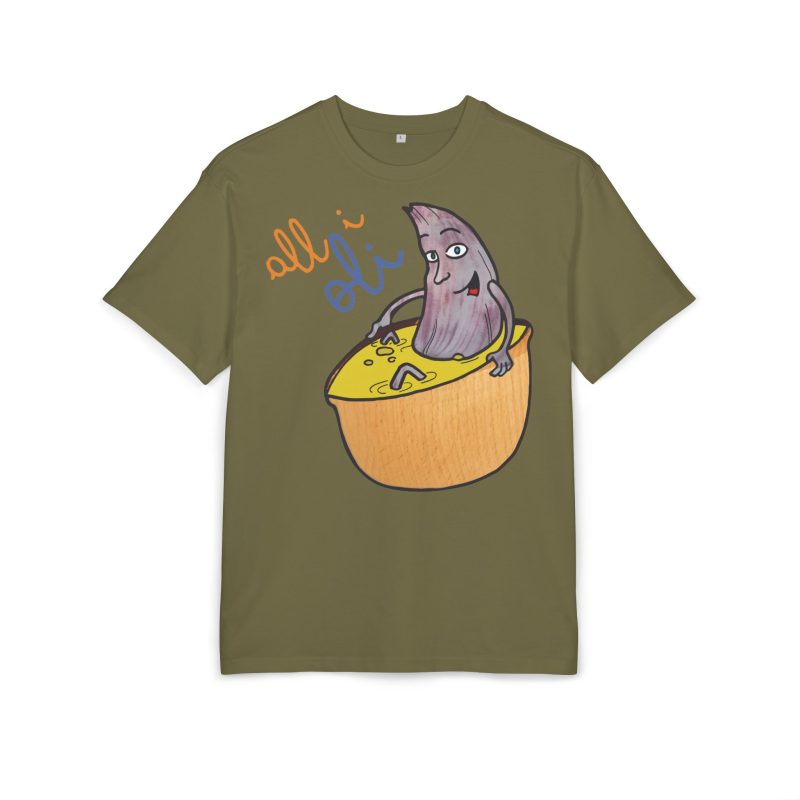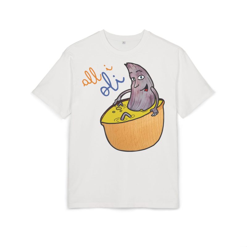 ¿El protagonista? ¡Una aceituna con mucho arte! La ilustración divertida y hecha a mano de ‘All i Oli’ descansando en un bowl de dip amarillo es una auténtica declaración de intenciones. Esa mezcla de desenfado y estilo único convierte esta camiseta en la pieza estrella para tus planes más chulos: un brunch con amigos, un paseo por el mercadillo, o simplemente disfrutar de un finde de sofá y manta.