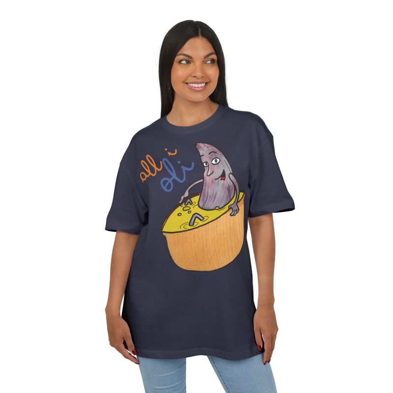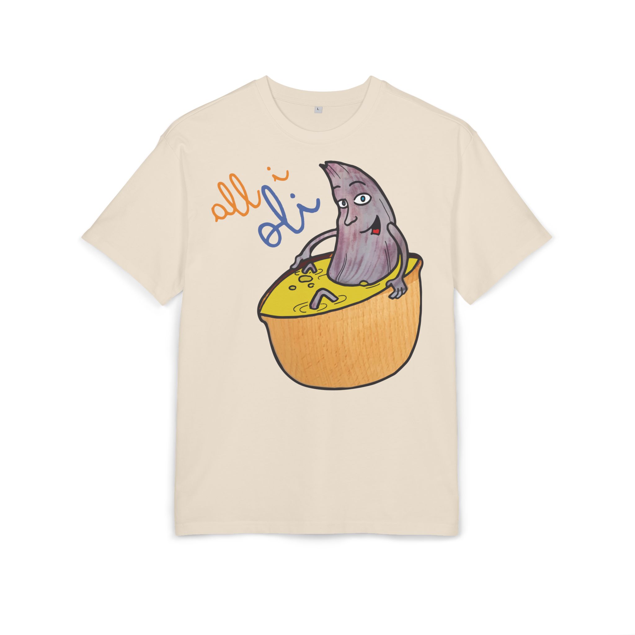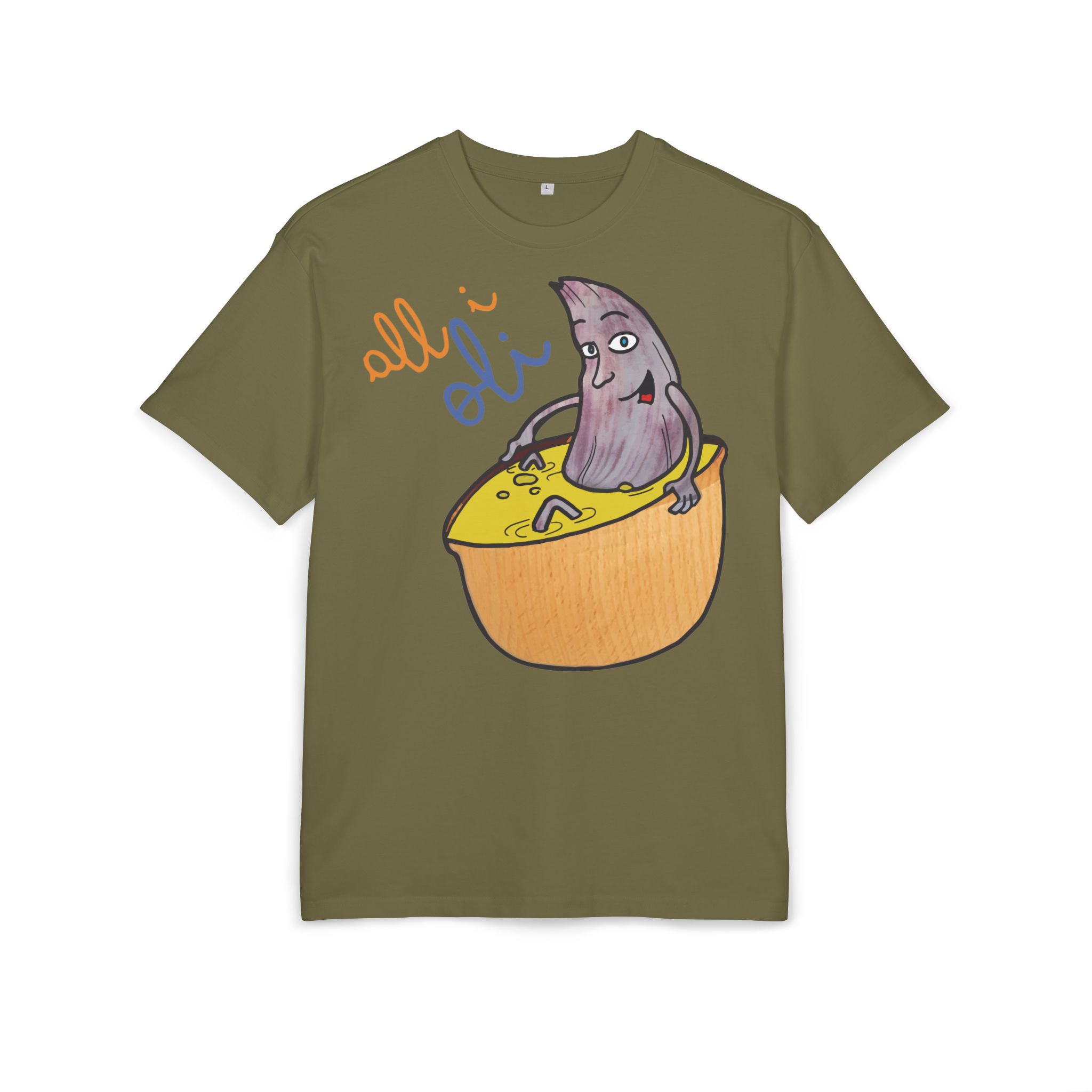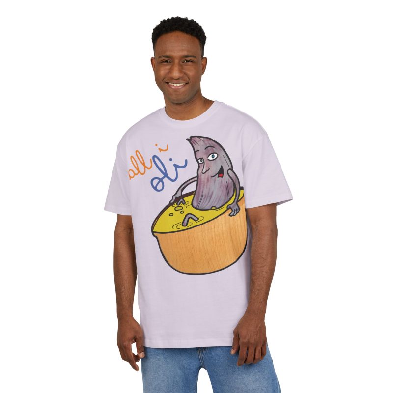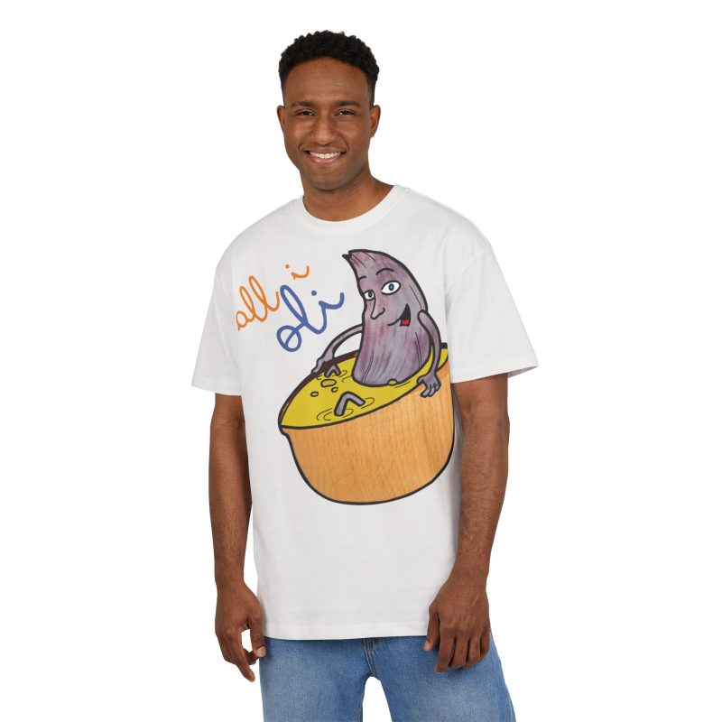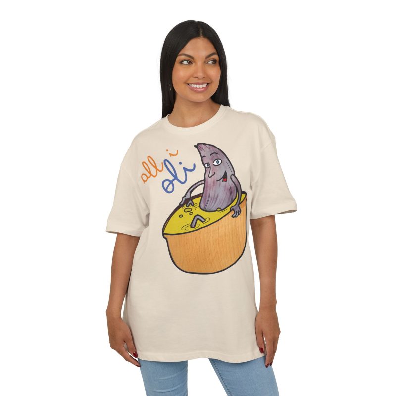 ¿El protagonista? ¡Una aceituna con mucho arte! La ilustración divertida y hecha a mano de ‘All i Oli’ descansando en un bowl de dip amarillo es una auténtica declaración de intenciones. Esa mezcla de desenfado y estilo único convierte esta camiseta en la pieza estrella para tus planes más chulos: un brunch con amigos, un paseo por el mercadillo, o simplemente disfrutar de un finde de sofá y manta.