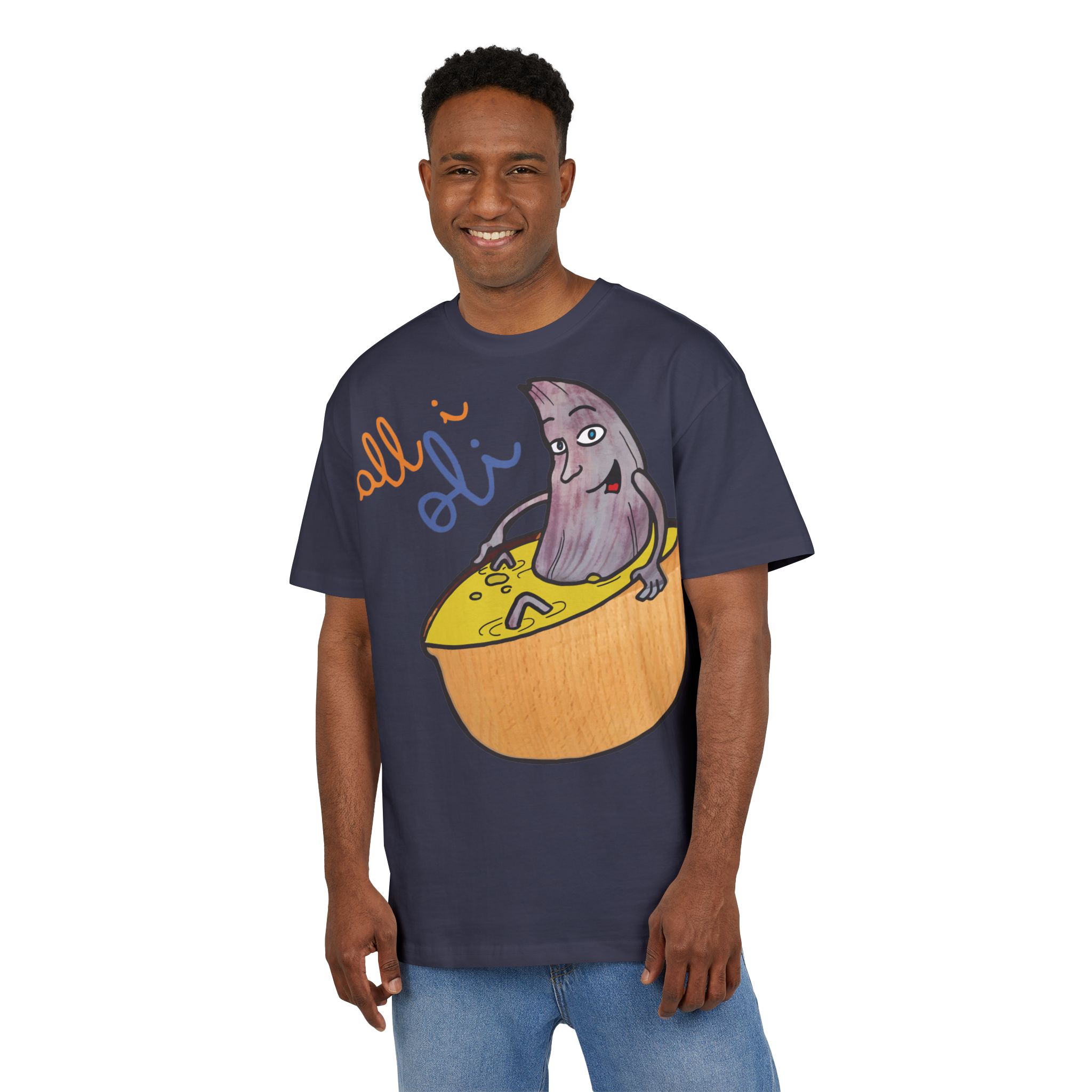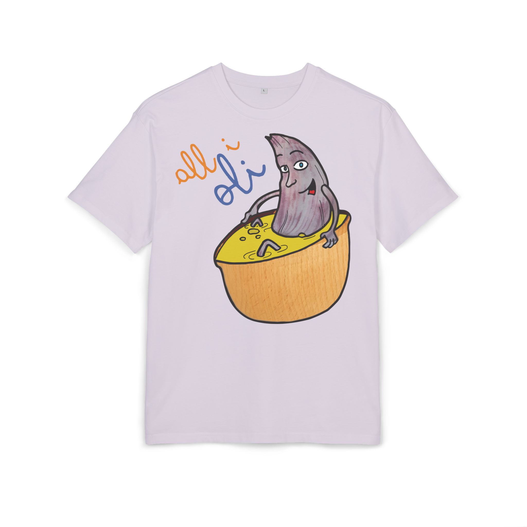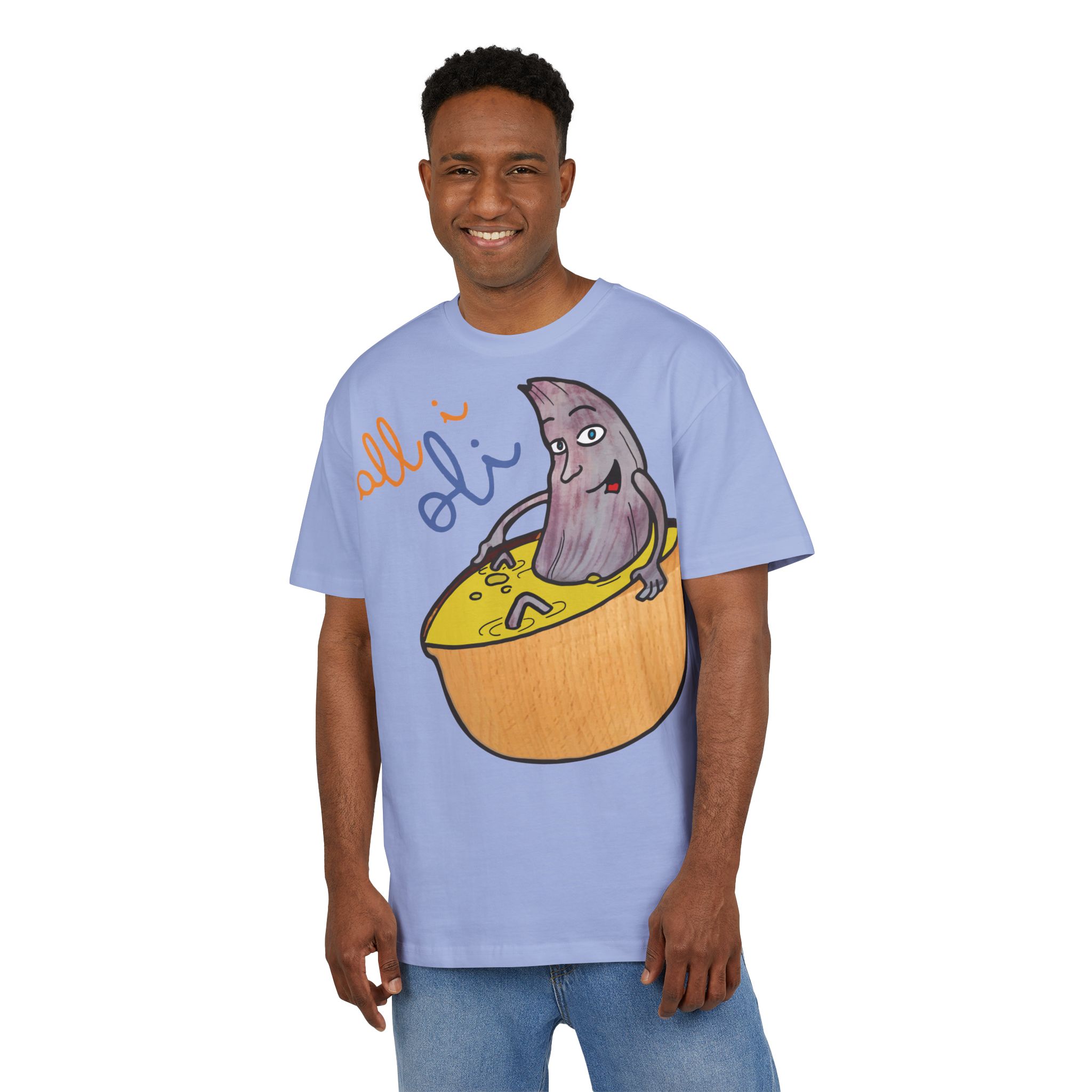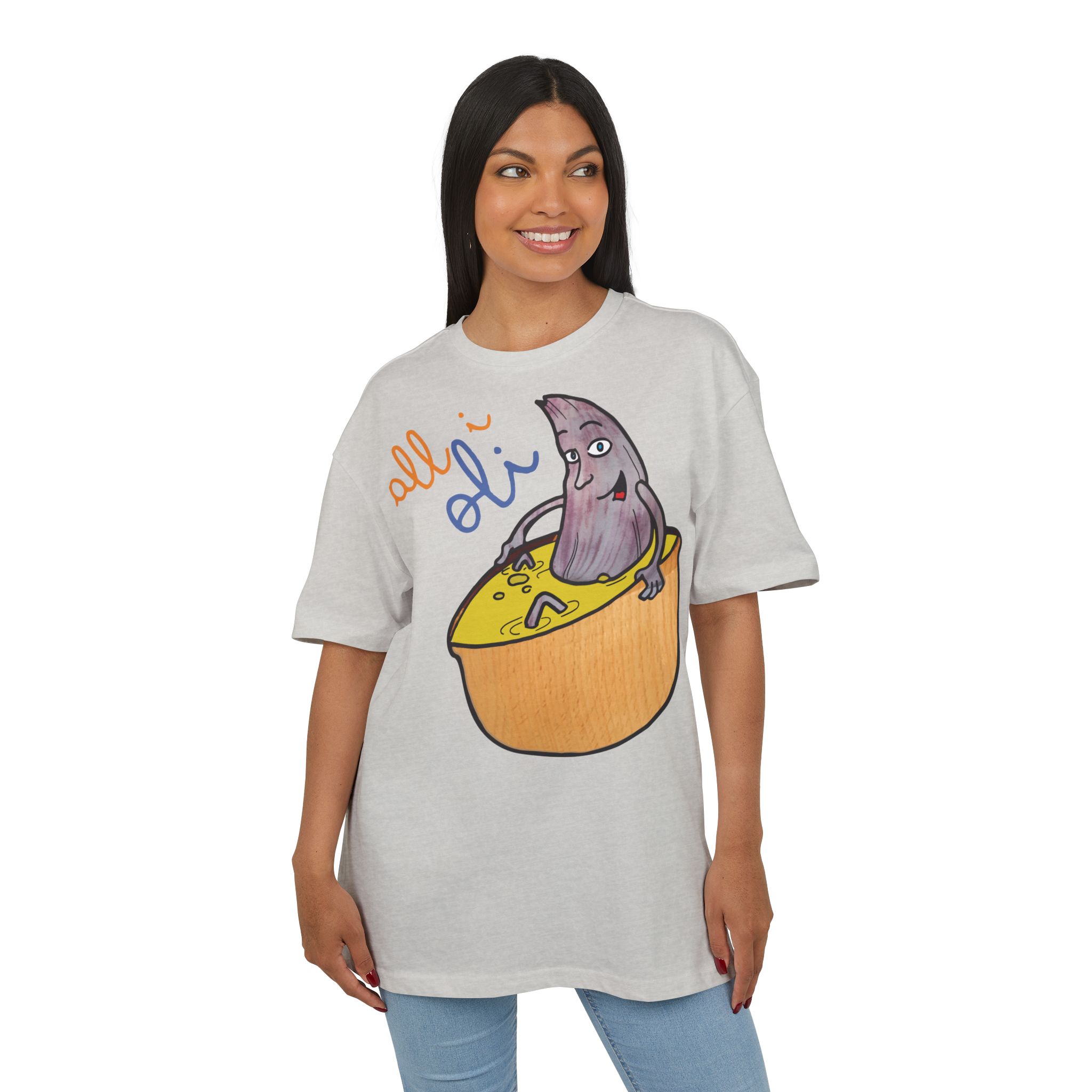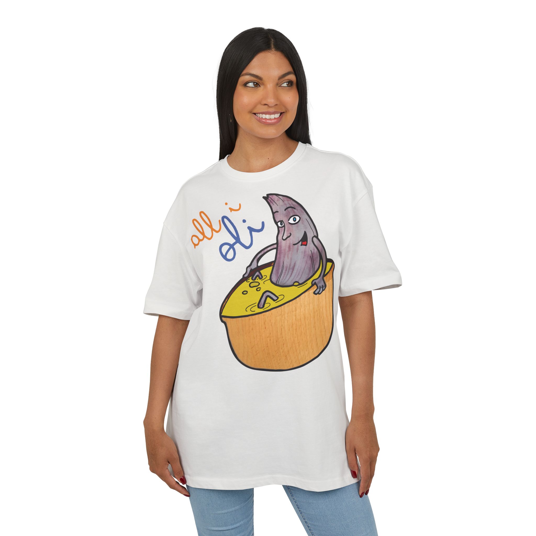 ¿El protagonista? ¡Una aceituna con mucho arte! La ilustración divertida y hecha a mano de ‘All i Oli’ descansando en un bowl de dip amarillo es una auténtica declaración de intenciones. Esa mezcla de desenfado y estilo único convierte esta camiseta en la pieza estrella para tus planes más chulos: un brunch con amigos, un paseo por el mercadillo, o simplemente disfrutar de un finde de sofá y manta.