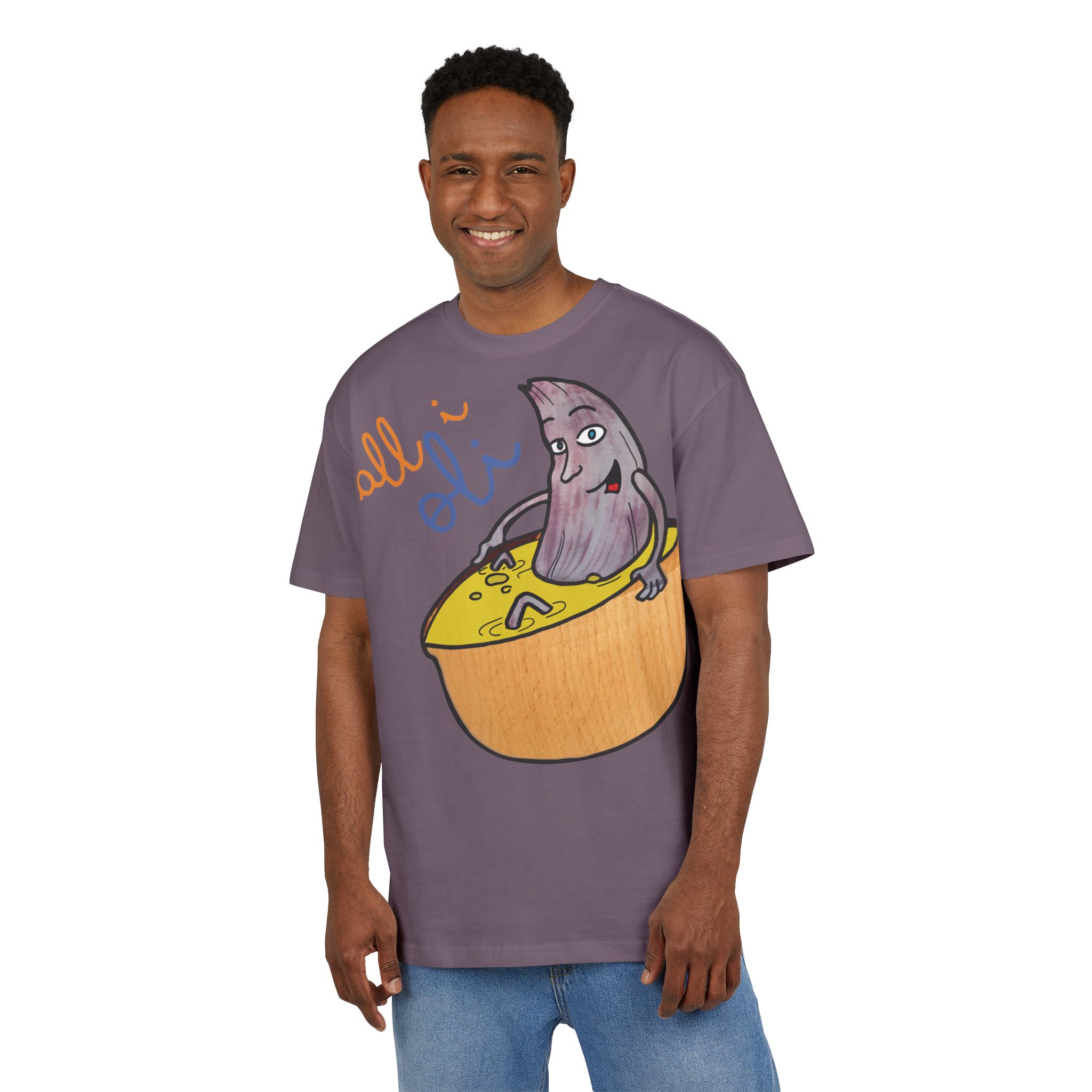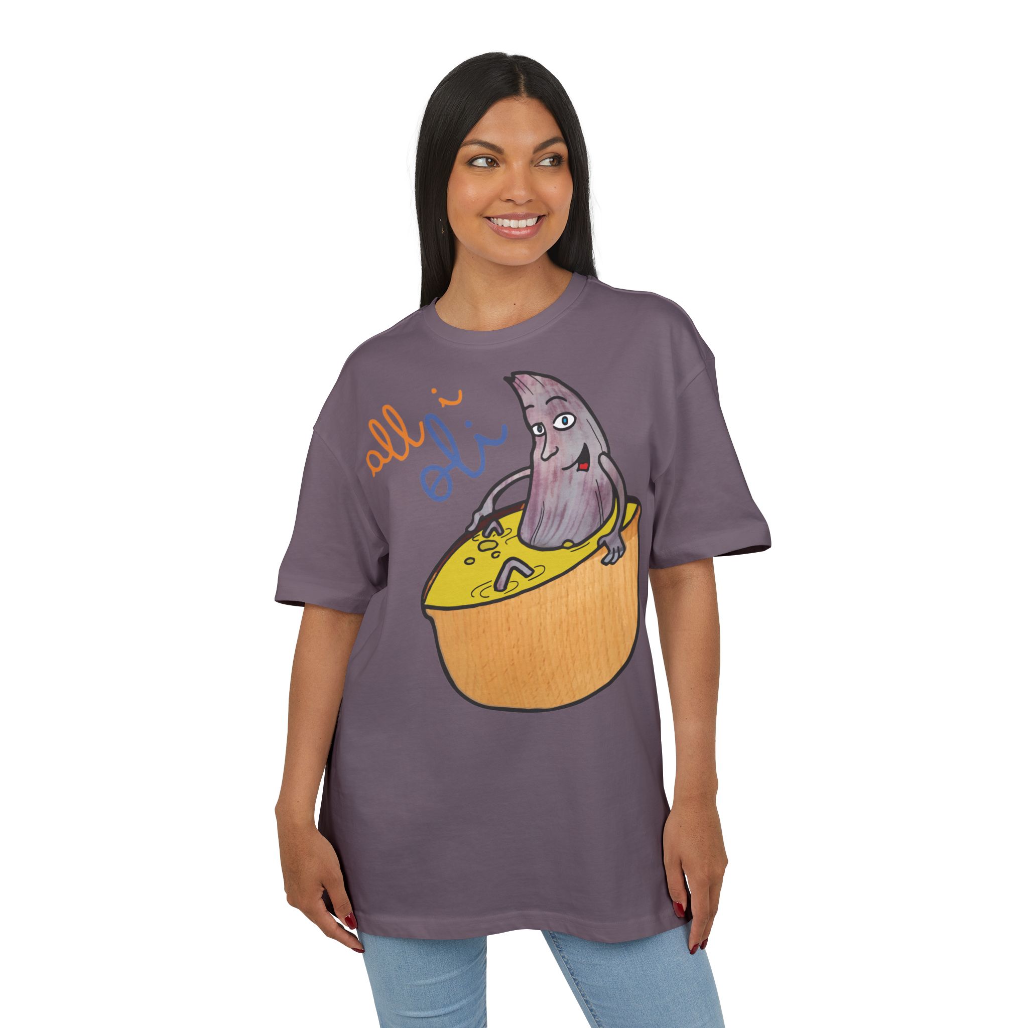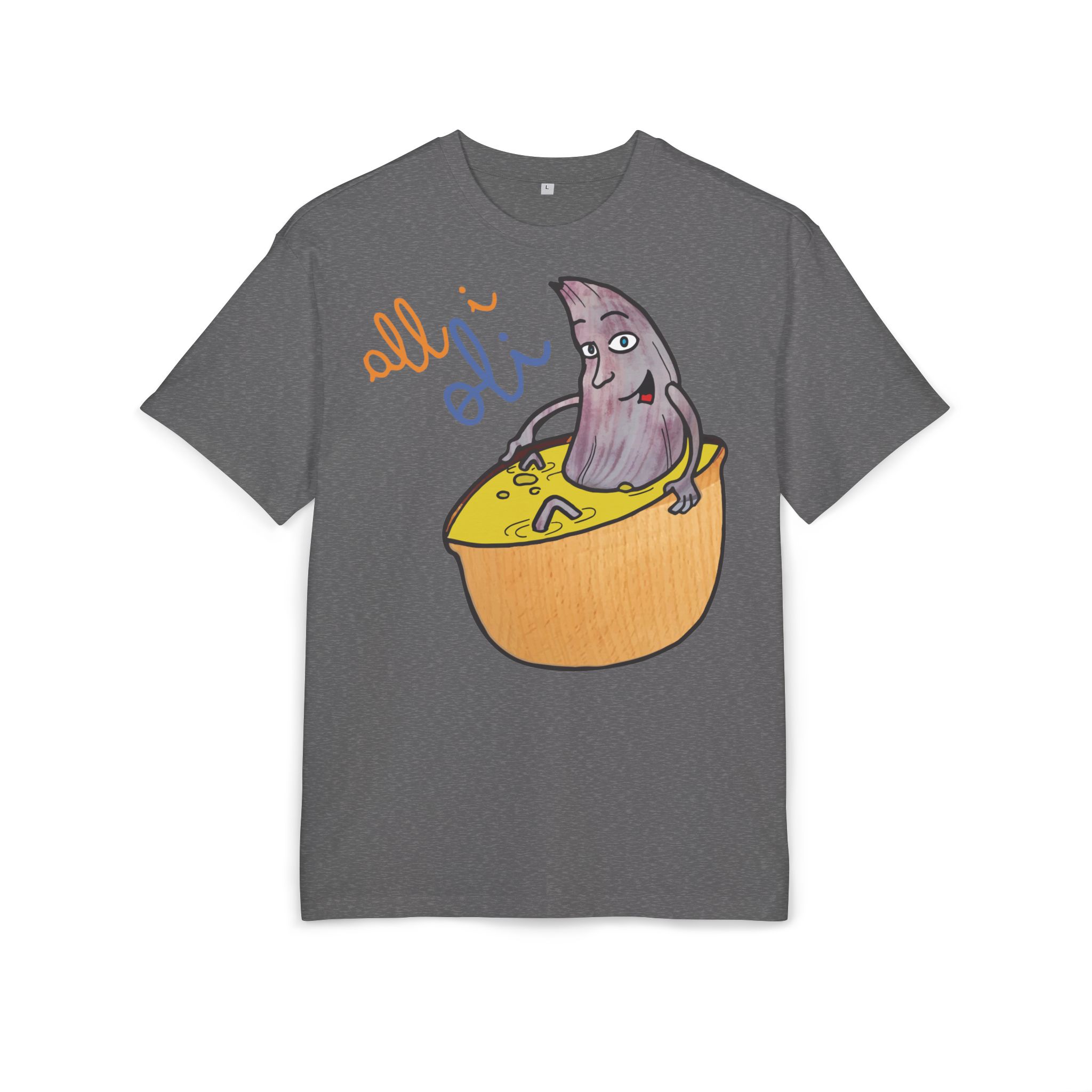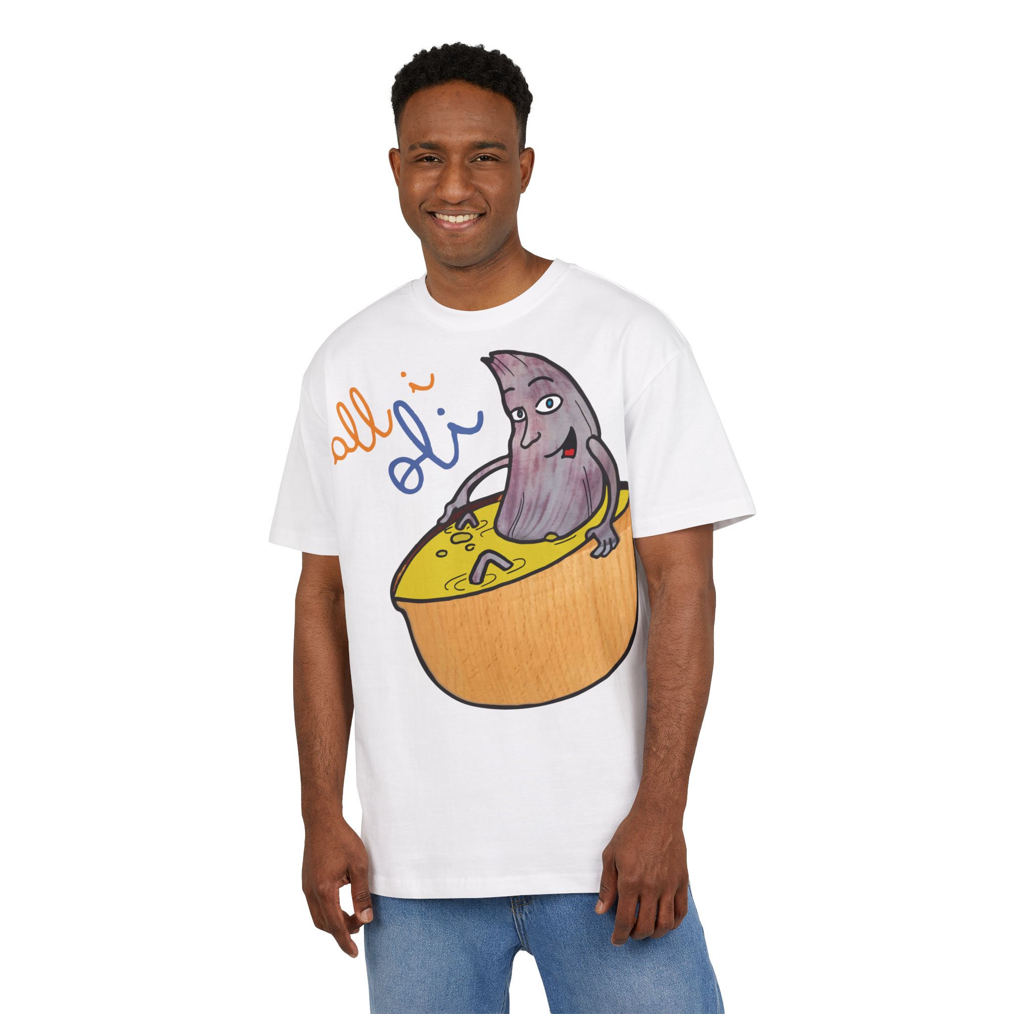 ¿El protagonista? ¡Una aceituna con mucho arte! La ilustración divertida y hecha a mano de ‘All i Oli’ descansando en un bowl de dip amarillo es una auténtica declaración de intenciones. Esa mezcla de desenfado y estilo único convierte esta camiseta en la pieza estrella para tus planes más chulos: un brunch con amigos, un paseo por el mercadillo, o simplemente disfrutar de un finde de sofá y manta.
