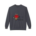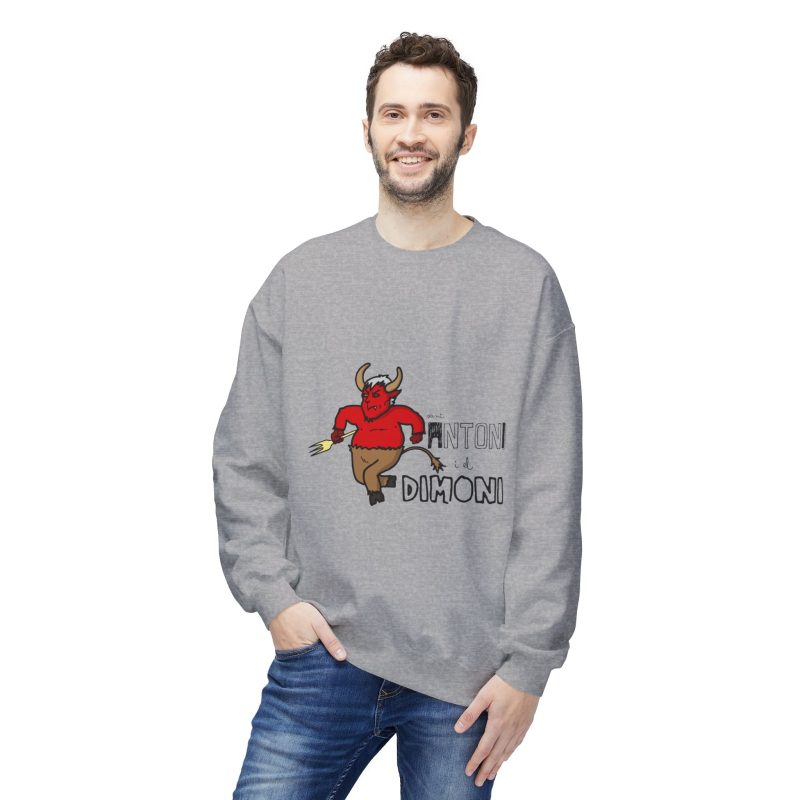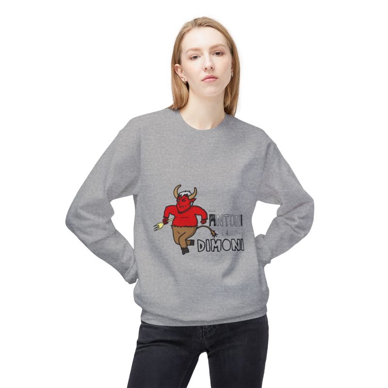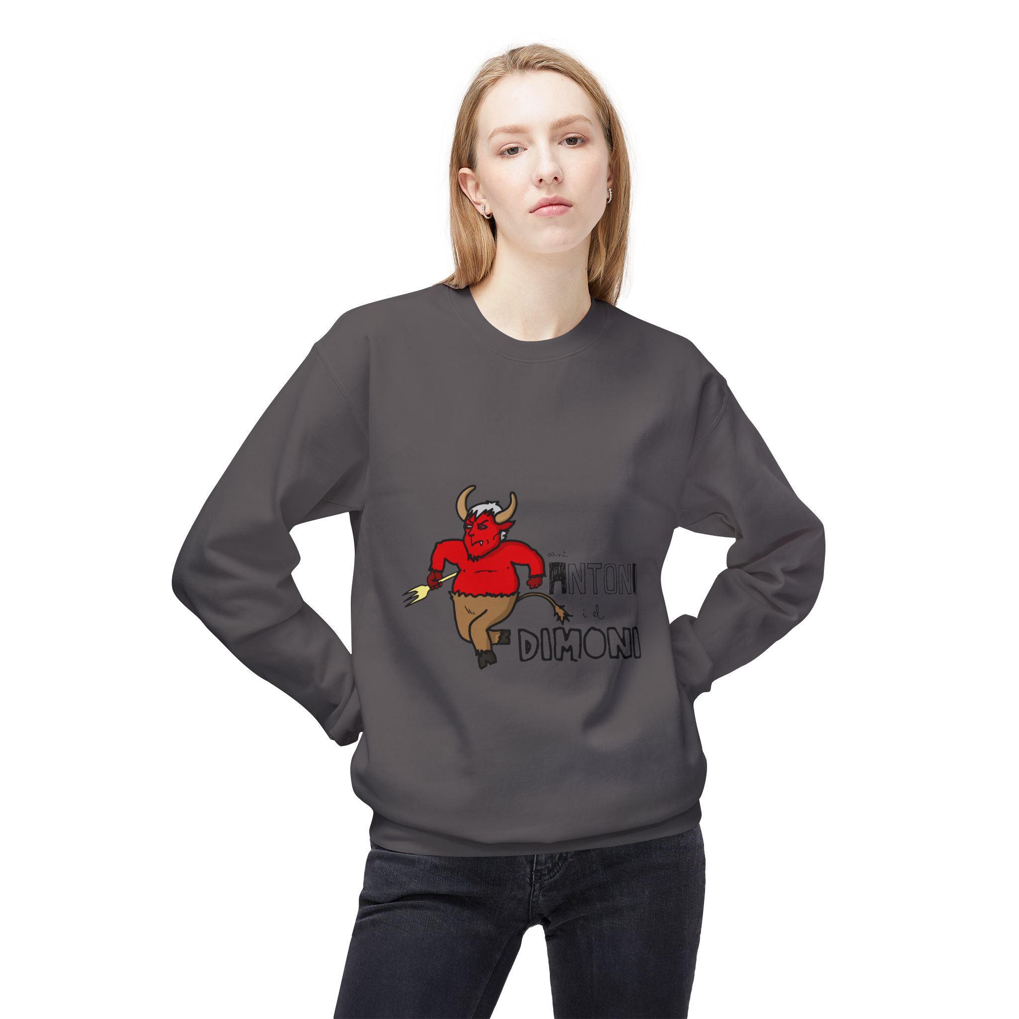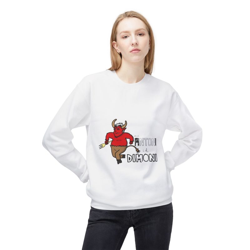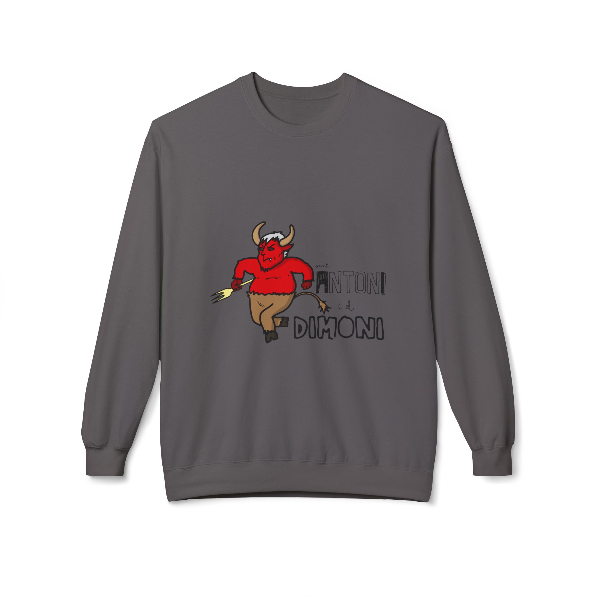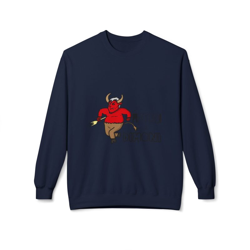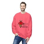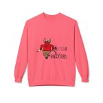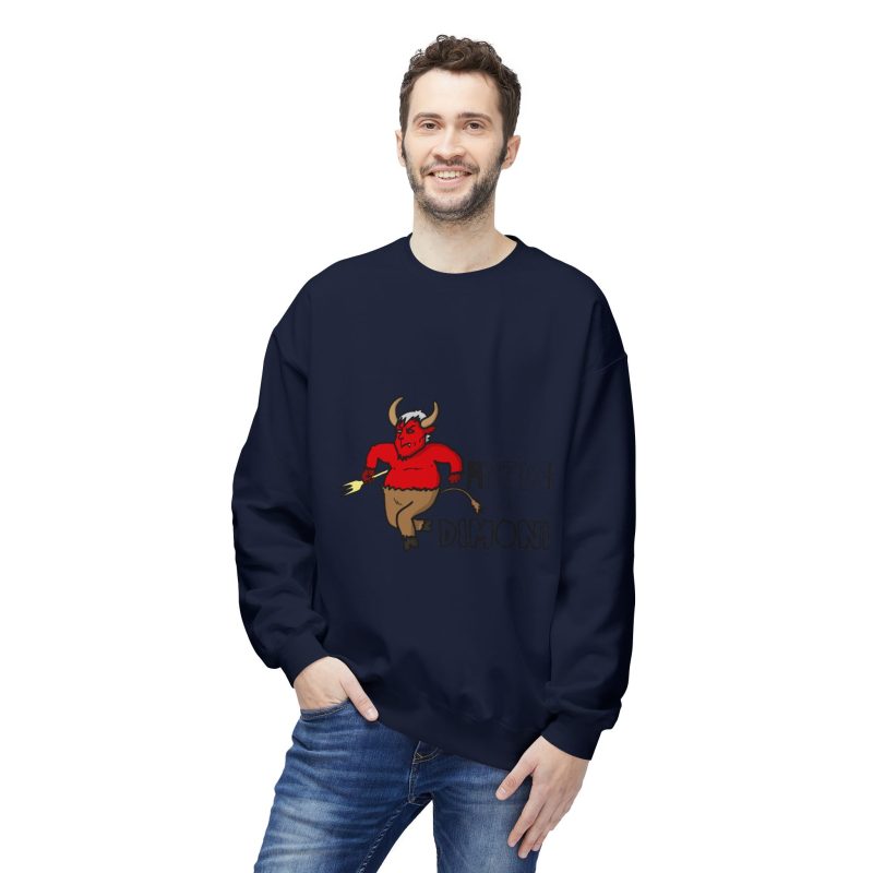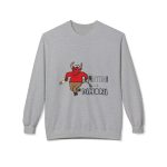 This midweight crewneck sweatshirt brings a playful, slightly rebellious energy to everyday wear. The soft, substantial fabric and relaxed dropped shoulders create a cozy silhouette that’s easy to layer. A spirited demon illustration and bold lettering add character — wear it when you want to inject humor into a chilly morning walk, a late-night hangout, or a casual weekend run of errands. The ribbed cuffs and hem hold shape after wear, and the smooth tubular knit keeps the look clean and simple so the graphic stands out without fuss. It feels lived-in from the first wear and ages gracefully with repeated use.